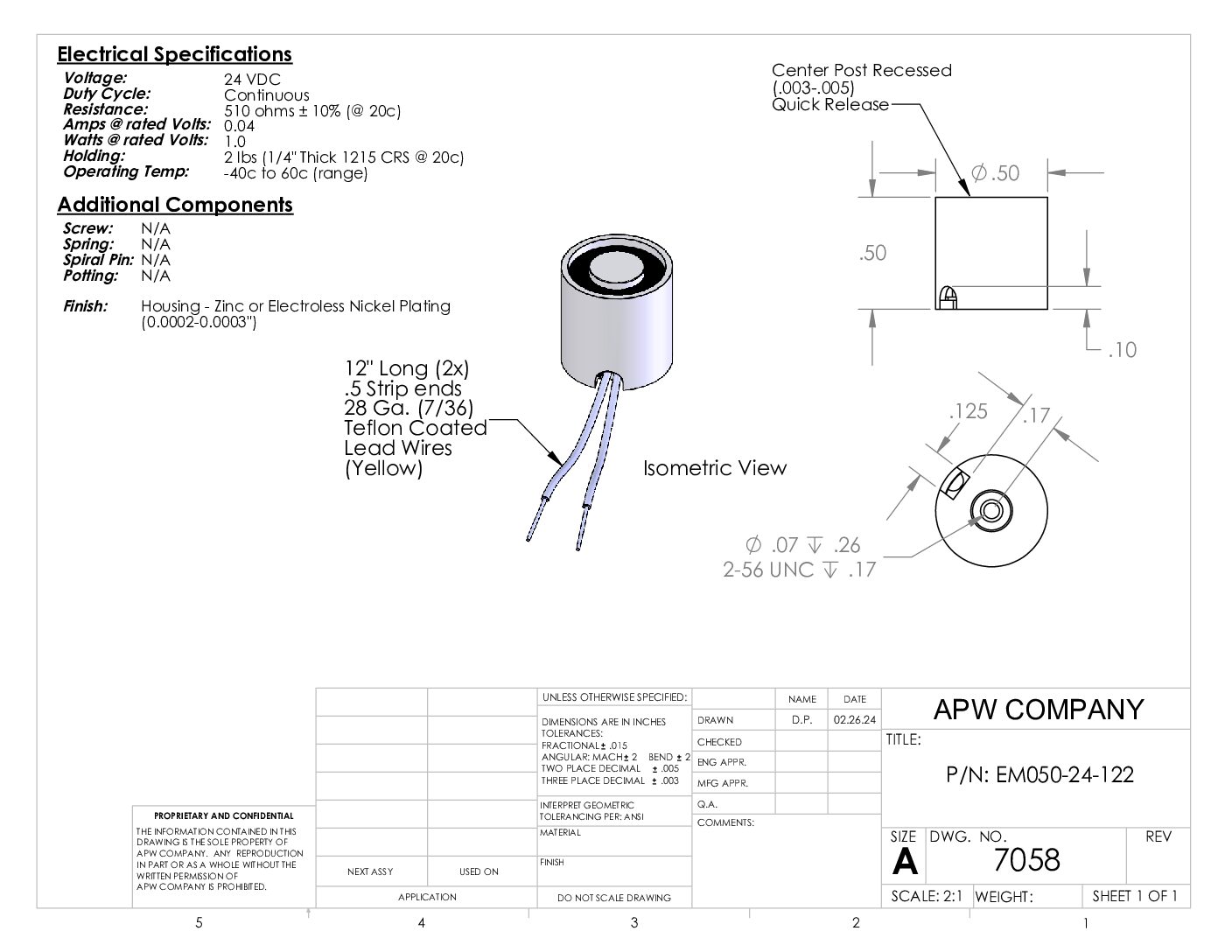 EM050-24-122 – Round Electromagnet 0.5 inch Dia. 24 volts DC – Holding 2 lbs.
