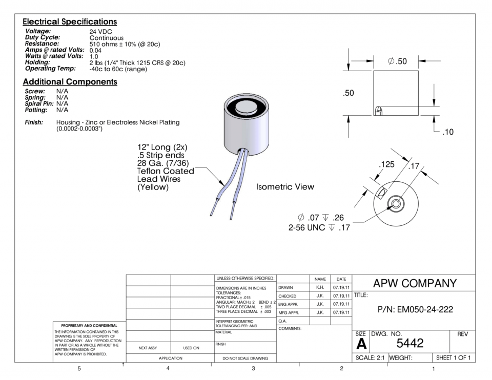 EM050-24-222 – Round Electromagnet 0.5 inch Dia. 24 volts DC – Holding 2 lbs.