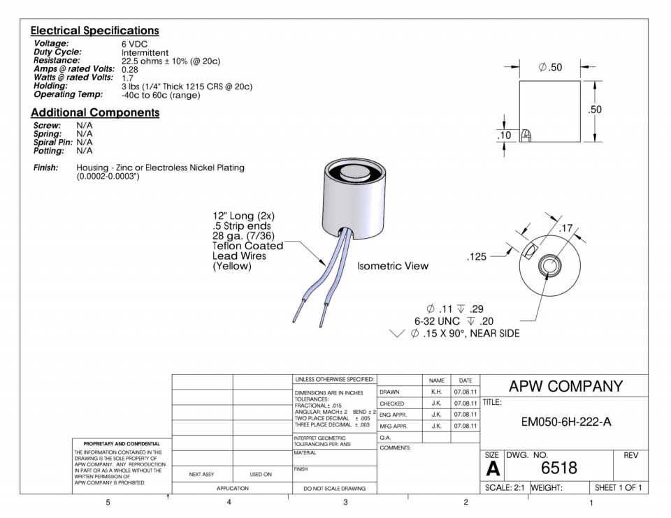 EM050-6H-22-A – Round Electromagnet 0.5 inch Dia. 6 volts DC – Holding 3 lbs.