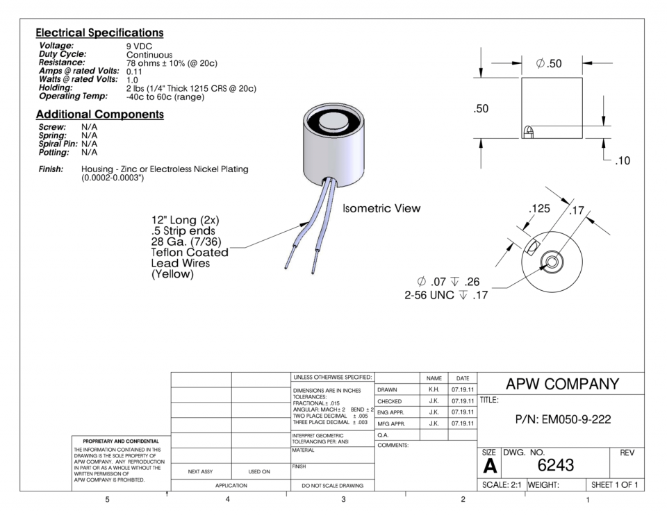 EM050-9-222 – Round Electromagnet 0.5 inch Dia. 9 volts DC – Holding 2 lbs.