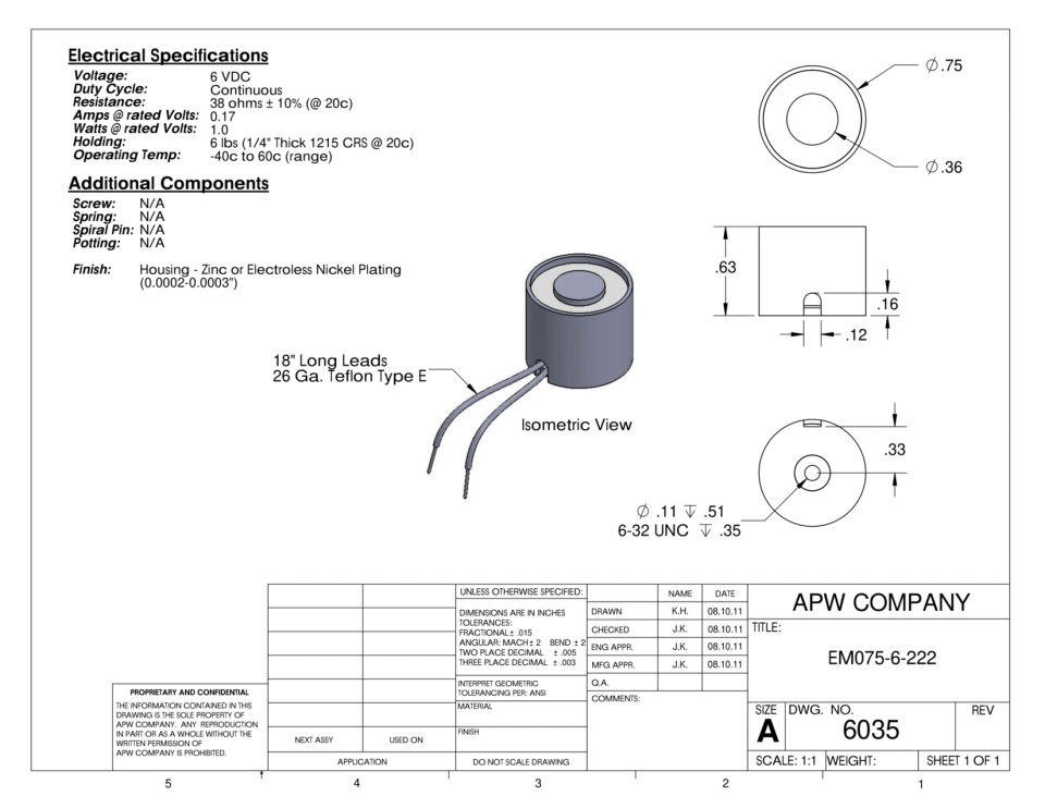 EM075-6-222 – Round Electromagnet 0.75 inch Dia. 6 volts DC – Holding 6 lbs.
