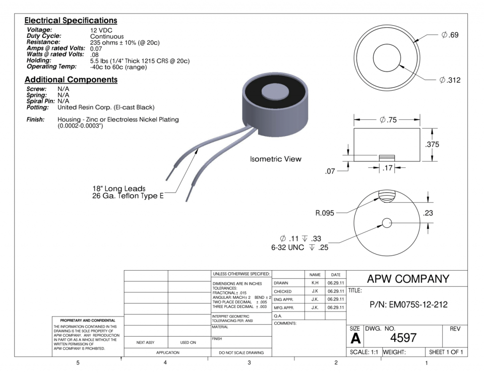 EM075S-12-212 – Round Electromagnet 0.75 inch Dia. 12 volts DC – Holding 5.5 lbs.
