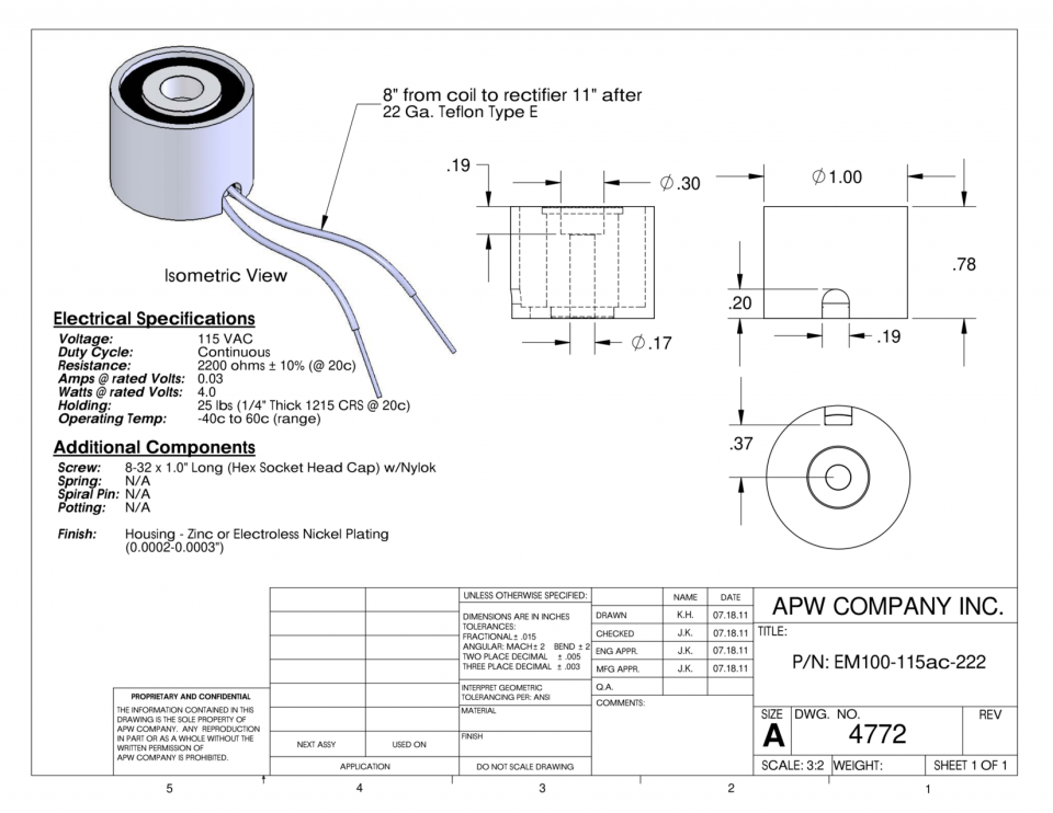 EM100-115ac-222 – Round Electromagnet 1 inch Dia. 115 volts AC – Holding 25 lbs.