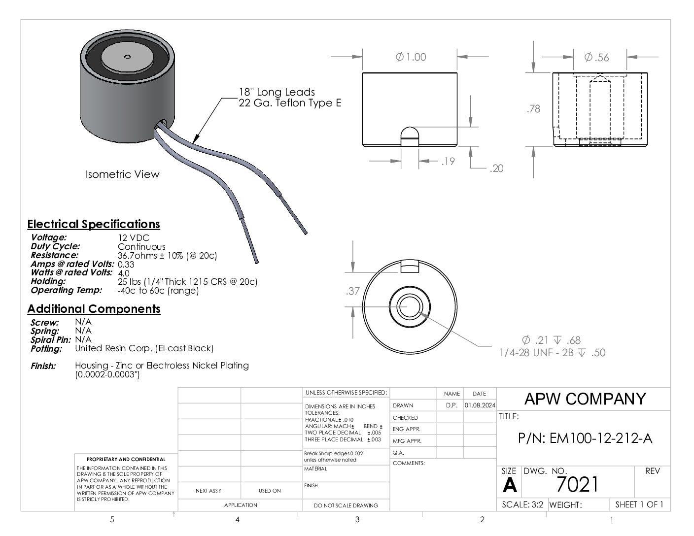 EM100-12-212-A – Round Electromagnet 1 inch Dia. 12 VDC – Holding 25 lbs.
