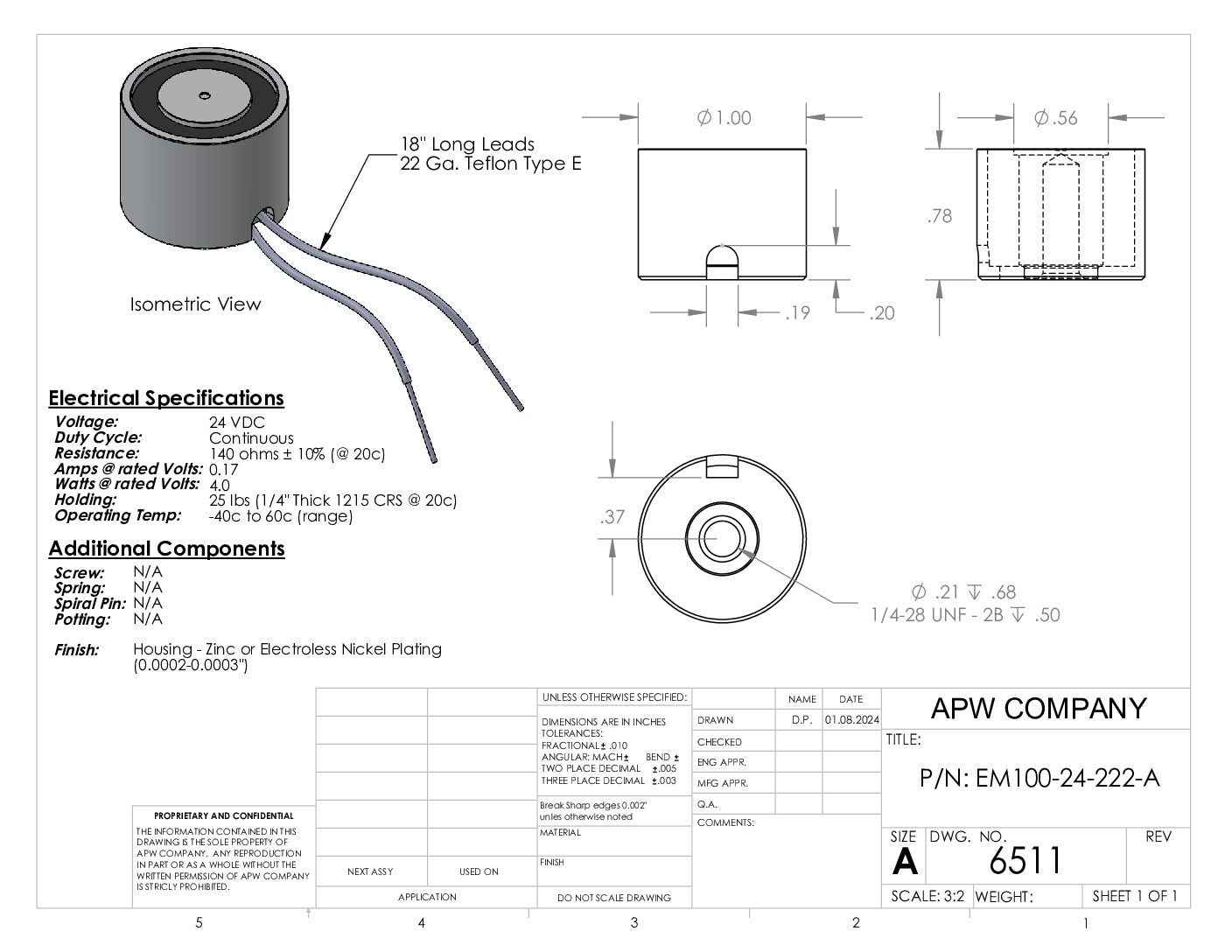 EM100-24-222-A – Round Electromagnet 1 inch Dia. 24 VDC – Holding 25 lbs.