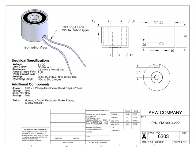 The EM100-3-222 is a precision-made round electromagnet designed for use in various mechanical and electrical applications. With a 1-inch diameter and the ability to hold up to 25 lbs. of weight, this high-quality device is ideal for applications where a compact and reliable solution is required. The electromagnet is powered by 3 volts DC and offers exceptional performance and reliability. Electromagnets are commonly used in industrial manufacturing, automation, robotics, and security systems, among other applications. The EM100-3-222 is a versatile and reliable product that is sure to meet the needs of any engineer looking for a powerful and durable electromagnet.