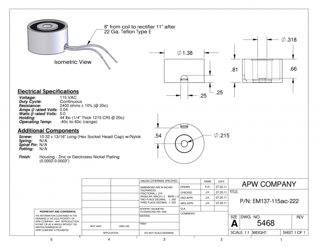 EM137-115ac-222 – Round Electromagnet 1.375 inch Dia. 115 volts AC – Holding 44 lbs.