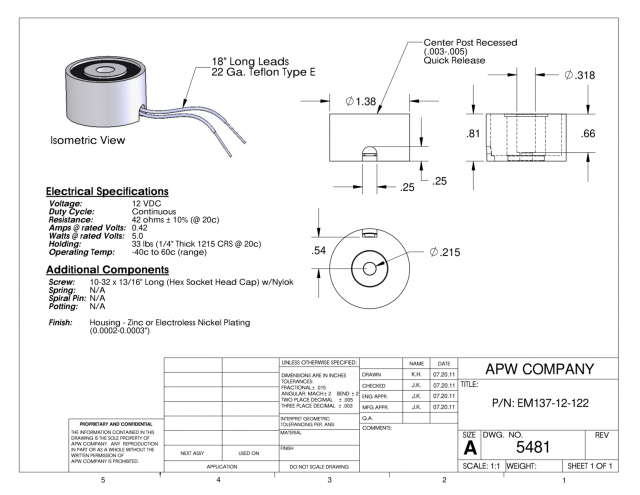 EM137-12-122 – Round Electromagnet 1.375 inch Dia. 12 volts DC – Holding 33 lbs.