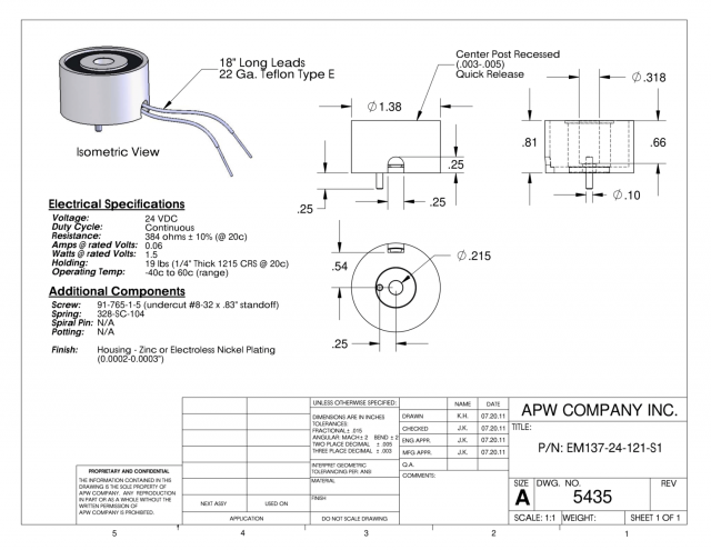 EM137-24-121-S1 – Round Electromagnet 1.375 inch Dia. 24 volts DC – Holding 19 lbs.