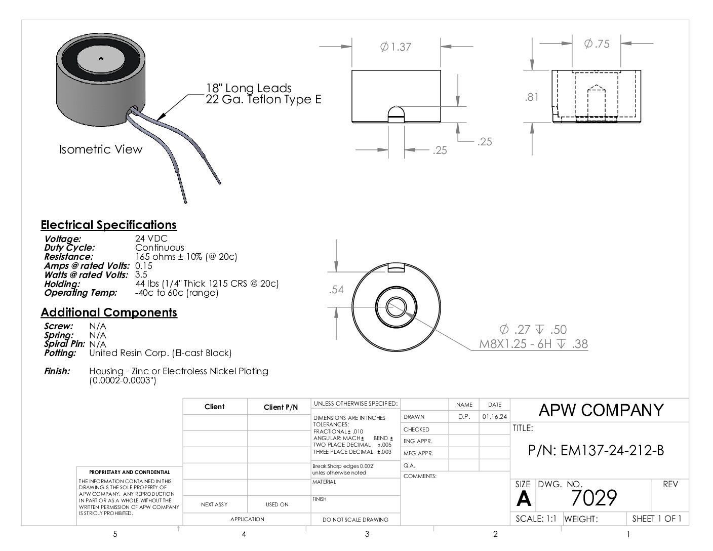 EM137-24-212-B – Round Electromagnet 1.375 inch Dia. 24 VDC – Holding 44 lbs.