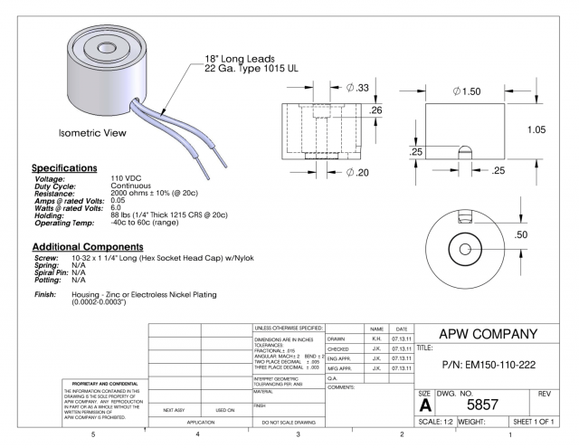 The EM150-110-222 is a high-quality, precision-made round electromagnet with a 1.5-inch diameter and a holding strength of 88 lbs. at 110 volts DC. This product is designed for use in various industrial applications, including metalworking, material handling, and automotive manufacturing, where strong and reliable holding force is necessary. Its compact size and high holding strength make it an ideal solution for limited-space applications. With a focus on durability and performance, the EM150-110-222 is an excellent choice for engineers seeking a reliable and precise electromagnet for their projects.