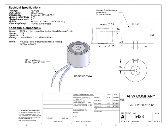 EM150-12-112 – Round Electromagnet 1.5 inch Dia. 24 volts DC – Holding 66 lbs.