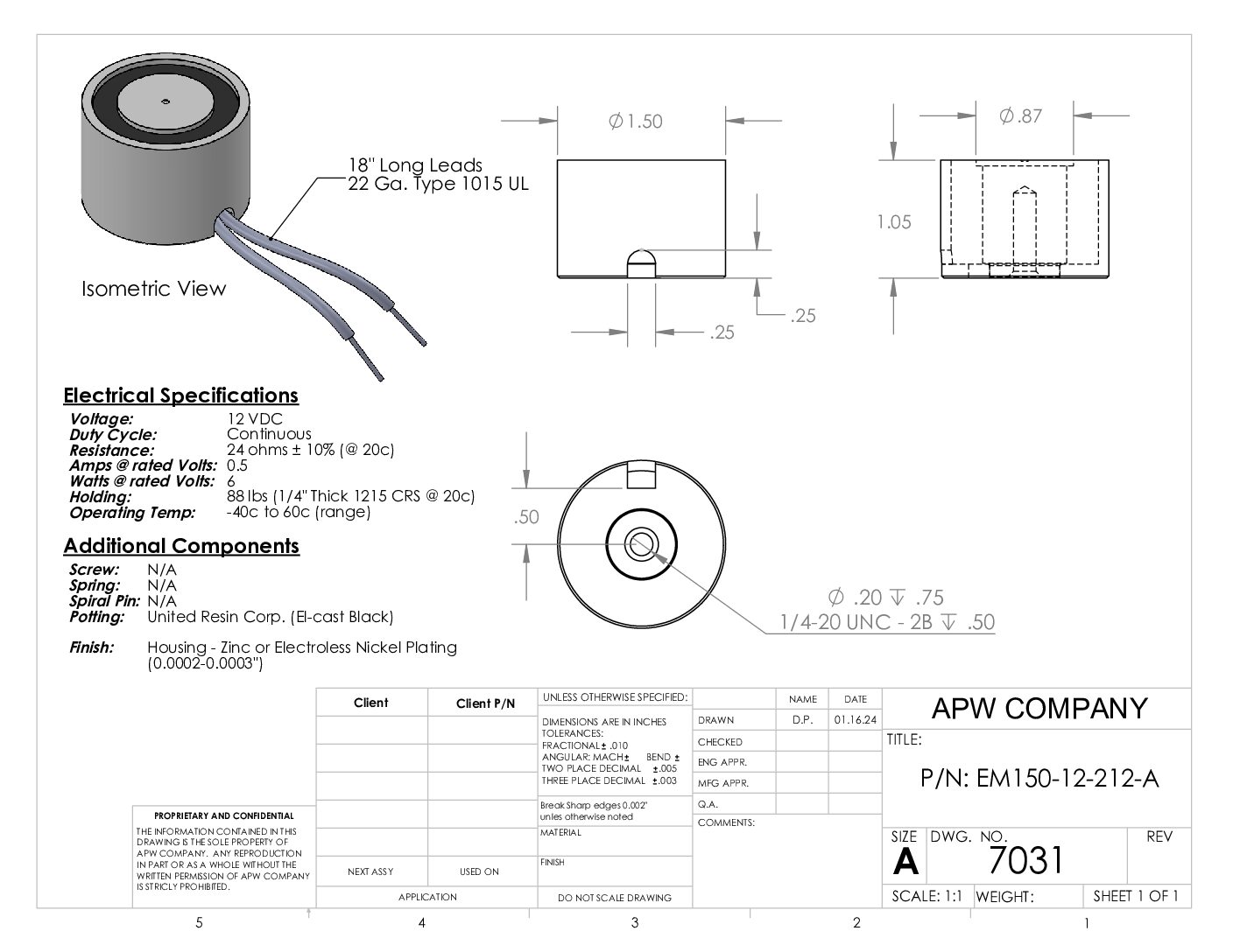 EM150-12-212-A – Round Electromagnet 1.5 inch Dia. 12 VDC – Holding 88 lbs.