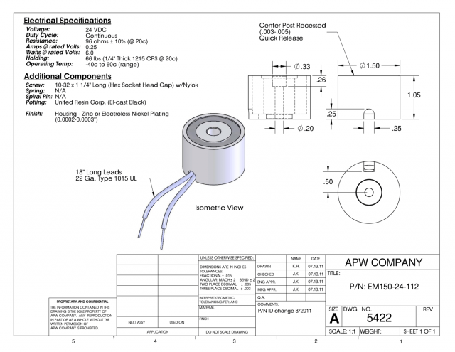 EM150-12-112 - Round Electromagnet 1.5 inch Dia. 24 volts DC - Holding 66 lbs.