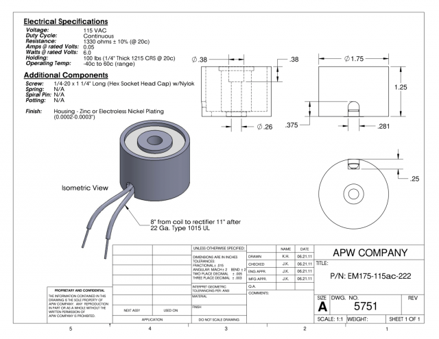 EM175-115ac-222 – Round Electromagnet 1.75 inch Dia. 115 volts AC – Holding 100 lbs.