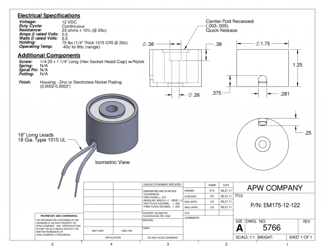 EM175-12-122 is a high-quality, precision-made round electromagnet with a diameter of 1.75 inches, holding capacity of 75 lbs. and operating at 12 volts DC. It has been designed and manufactured to meet the demands of various applications where electromagnets are used, including material handling, automation, and security systems. The product’s reliable performance is assured due to its superior construction and materials, making it suitable for use in harsh and challenging environments. Its compact size and versatility make it an ideal choice for a wide range of applications.