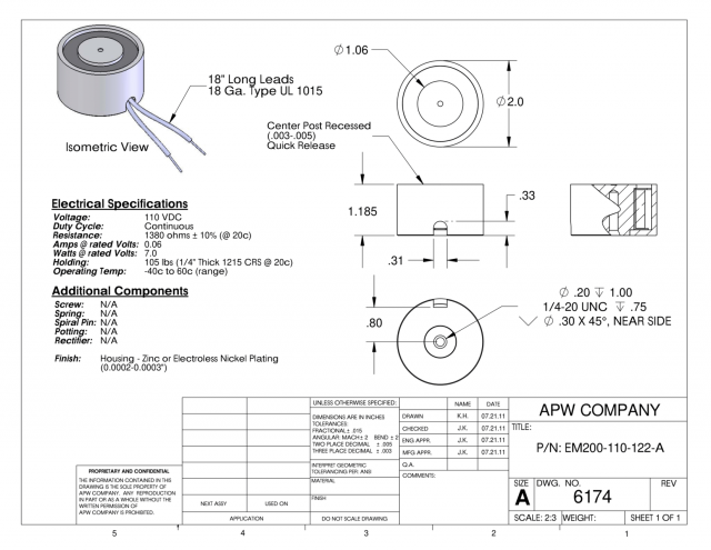 EM200-110-122-A – Round Electromagnet 2 inch Dia. 110 volts DC – Holding 105 lbs.