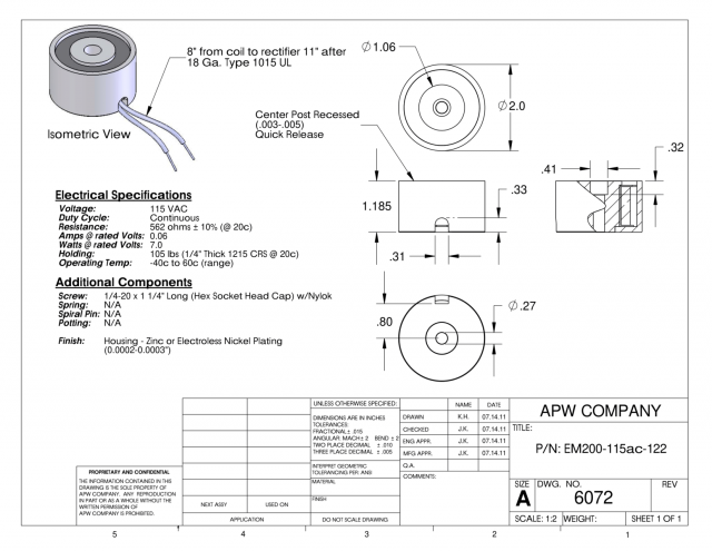 EM200-115ac-122 – Round Electromagnet 2 inch Dia. 115 volts AC – Holding 105 lbs.