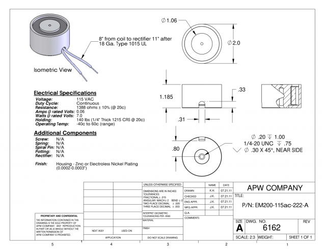 The EM200-115ac-222-A is a high quality, precision-made round electromagnet designed for mechanical and electrical engineers. This model has a holding force of 140 lbs, is 2 inches in diameter and operates at 115 volts AC. The product is suitable for a range of applications where electromagnets are used such as material handling, automation and robotics. The product is highly reliable and manufactured with strict quality control to ensure consistent performance. The EM200-115ac-222-A is an excellent choice for those seeking a durable and high-performing electromagnet.