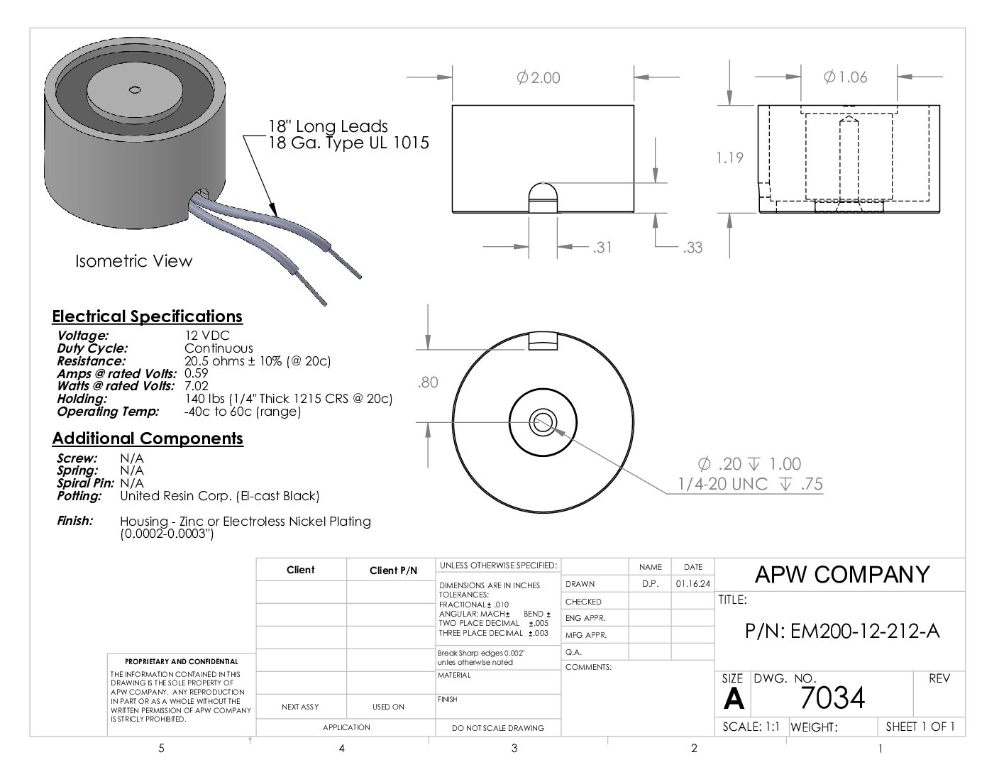 The EM200-12-212-A is a high-quality precision-made round electromagnet with a diameter of 2 inches, capable of holding up to 140 lbs. at 12 volts DC. This electromagnet is designed for a variety of applications in the mechanical and electrical engineering fields where the secure holding and release of metallic components is necessary. It is made from high-quality materials to ensure durability and reliability in the most demanding applications. The EM200-12-212-A is a superior electromagnet that delivers exceptional performance and is ideal for use in industrial automation, robotics, and material handling systems.
