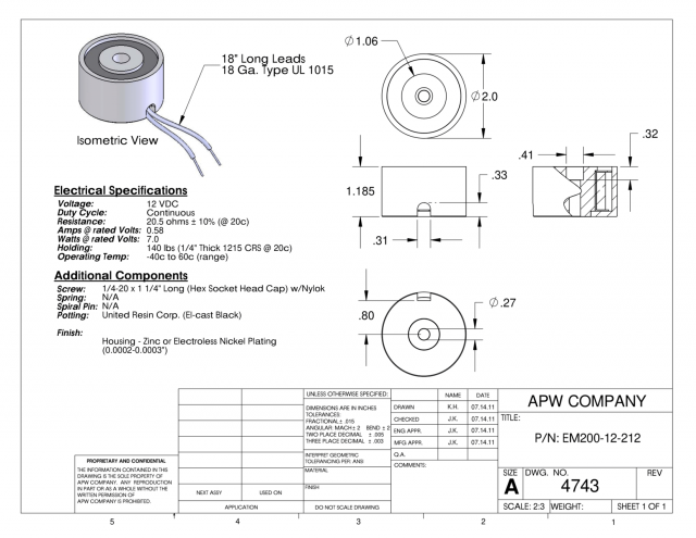 EM200-12-212 – Round Electromagnet 2 inch Dia. 12 volts DC – Holding 140 lbs.