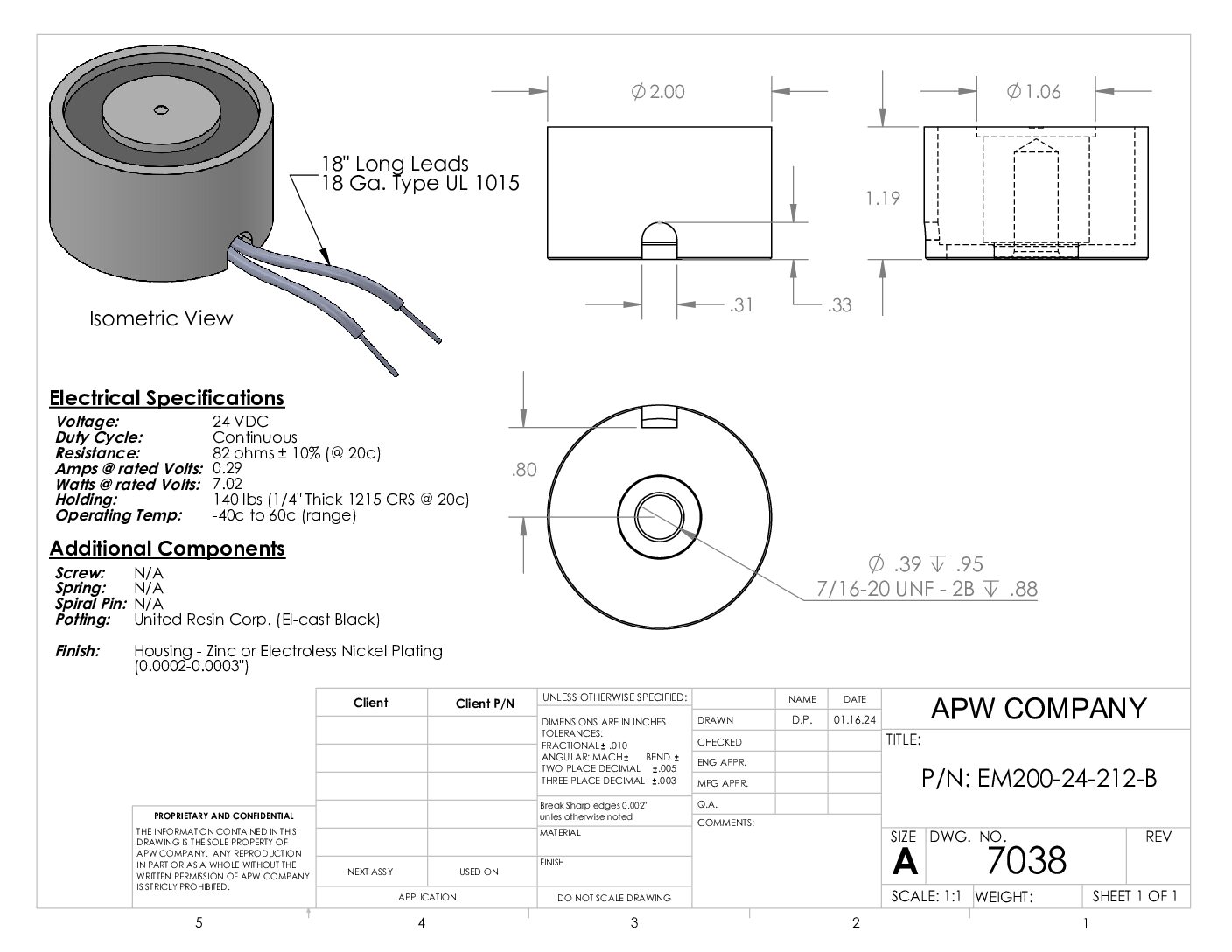 EM200-24-212-B – Round Electromagnet 2 inch Dia. 24 VDC – Holding 140 lbs.
