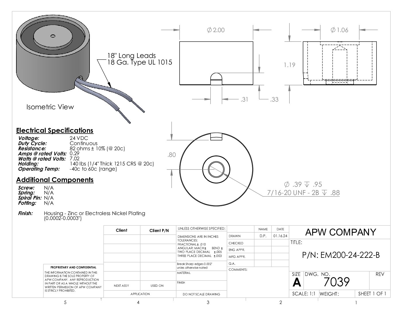 EM200-24-222-B – Round Electromagnet 2 inch Dia. 24 VDC – Holding 140 lbs.