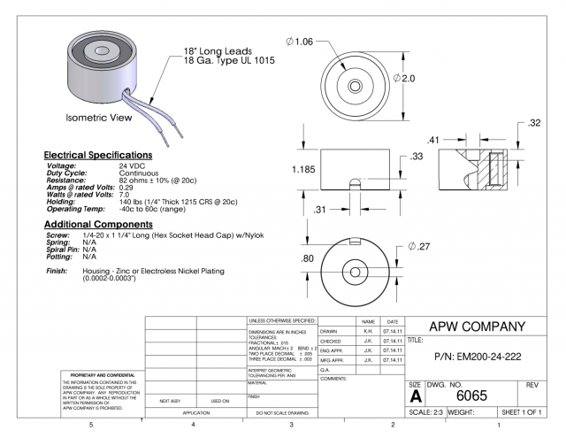 The EM200-24-222 is a high-quality, precision-made round electromagnet designed for mechanical and electrical engineers. With a holding force of 140 lbs and a 2-inch diameter, it operates on 24 volts DC. This product is suitable for a wide range of applications where a strong holding force is required, such as material handling, door locks, and security systems. With its durable construction and reliable performance, this electromagnet is an excellent choice for any project that requires precise control and high holding strength.