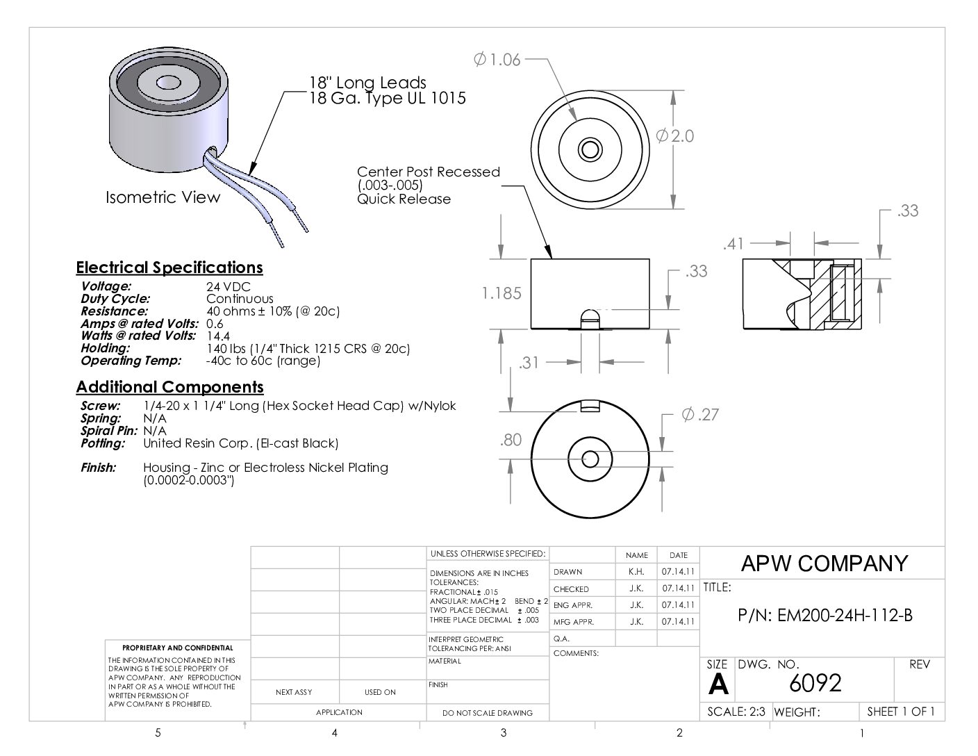 EM200-24H-112-B – Round Electromagnet 2 inch Dia. 24 volts DC – Holding 140 lbs.