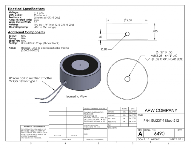 EM237-115ac-212 – Round Electromagnet 2.37 inch Dia. 115 volts AC – Holding 190 lbs.
