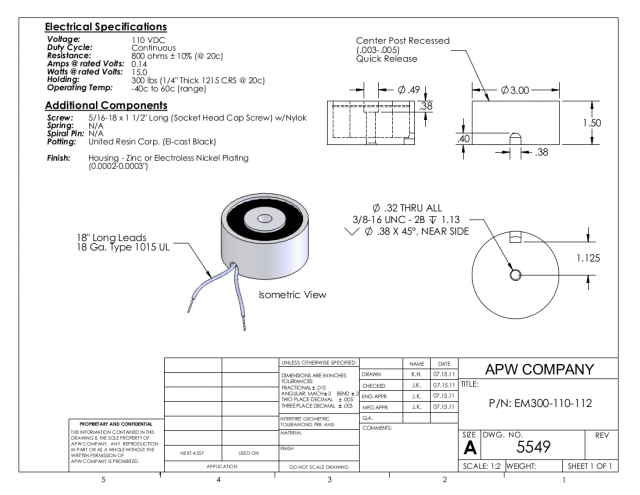 EM300-110-112 – Round Electromagnet 3 inch Dia. 110 volts DC – Holding 300 lbs.