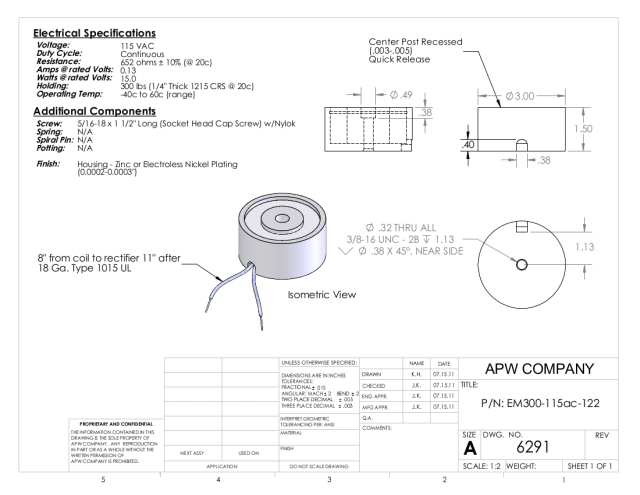 EM300-115AC-122 – Round Electromagnet 3 inch Dia. 115 volts AC – Holding 300 lbs.