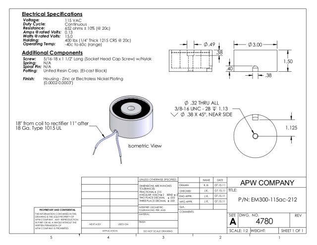 EM300-115ac-212 – Round Electromagnet 3 inch Dia. 115 volts AC – Holding 400 lbs.
