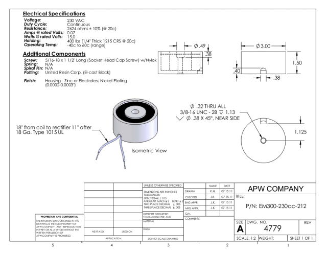 EM300-230ac-212 – Round Electromagnet 3 inch Dia. 230 volts AC – Holding 400 lbs.
