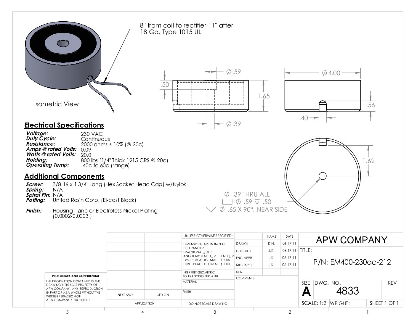 EM400-230ac-212 – Round Electromagnet 4 inch Dia. 230 volts AC – Holding 800 lbs.