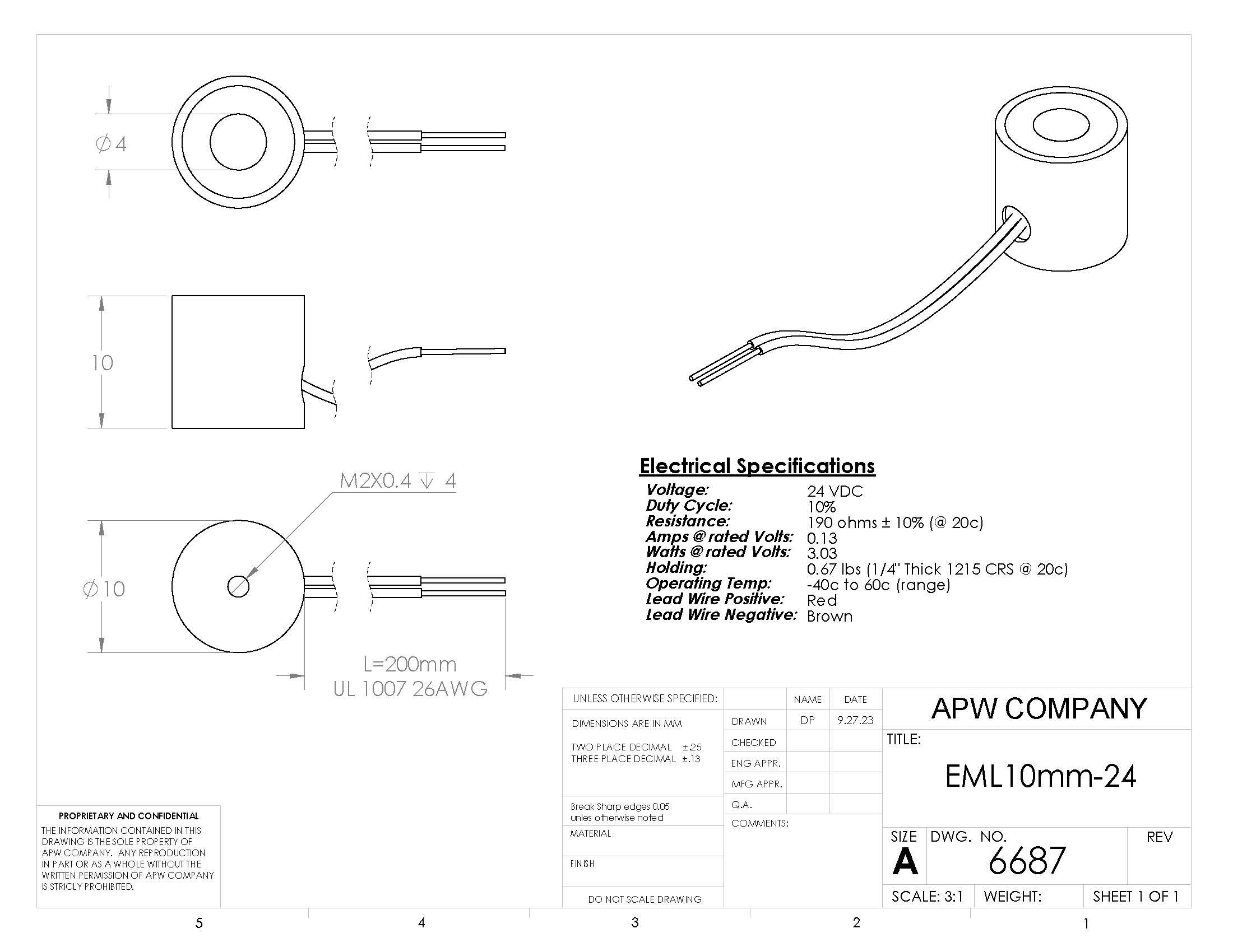 EML10mm-24 – Round Permanent Electromagnet 10 mm Dia. 24 volts DC – Holding 0.67 lbs.