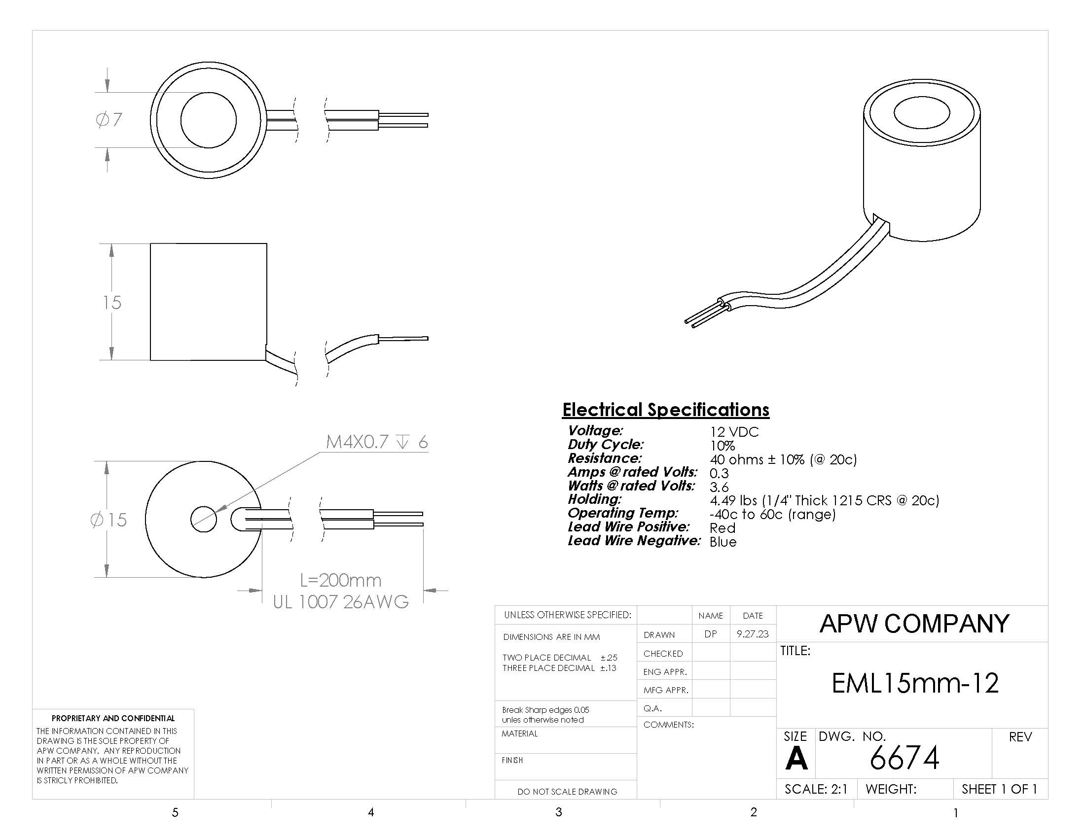 The EML15mm-12 Round Permanent Electromagnet is a high-quality and precision-made product designed to operate on 12 volts DC. With a diameter of 15 mm and a holding capacity of 4.49 lbs, this electromagnet is ideal for use in a range of applications, such as material handling, magnetic separation, and clamping. The product is manufactured with the highest level of precision and quality to ensure reliable performance and durability. It is an excellent choice for mechanical and electrical engineers seeking a robust and efficient solution for their electromagnetic needs, and will perform exceptionally well in various settings.