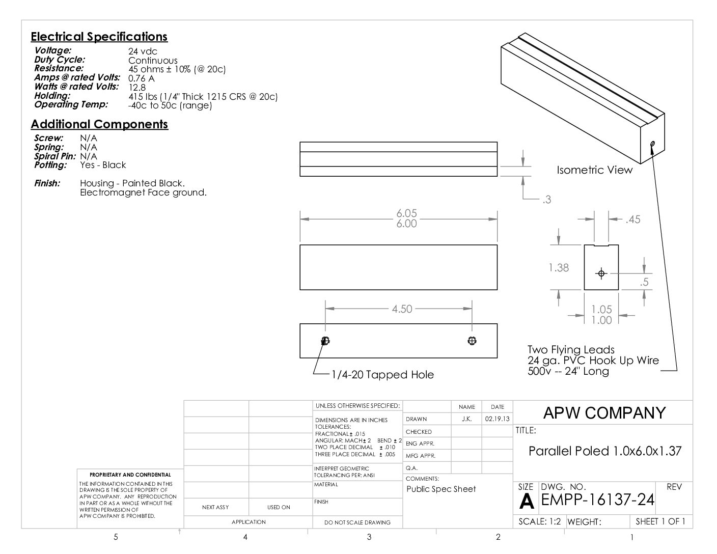 EMPP-16137-24 Parallel Pole Electromagnet 1.0 W x 6.0 L x 1.27 H – 24 vdc Holding 415 lbs