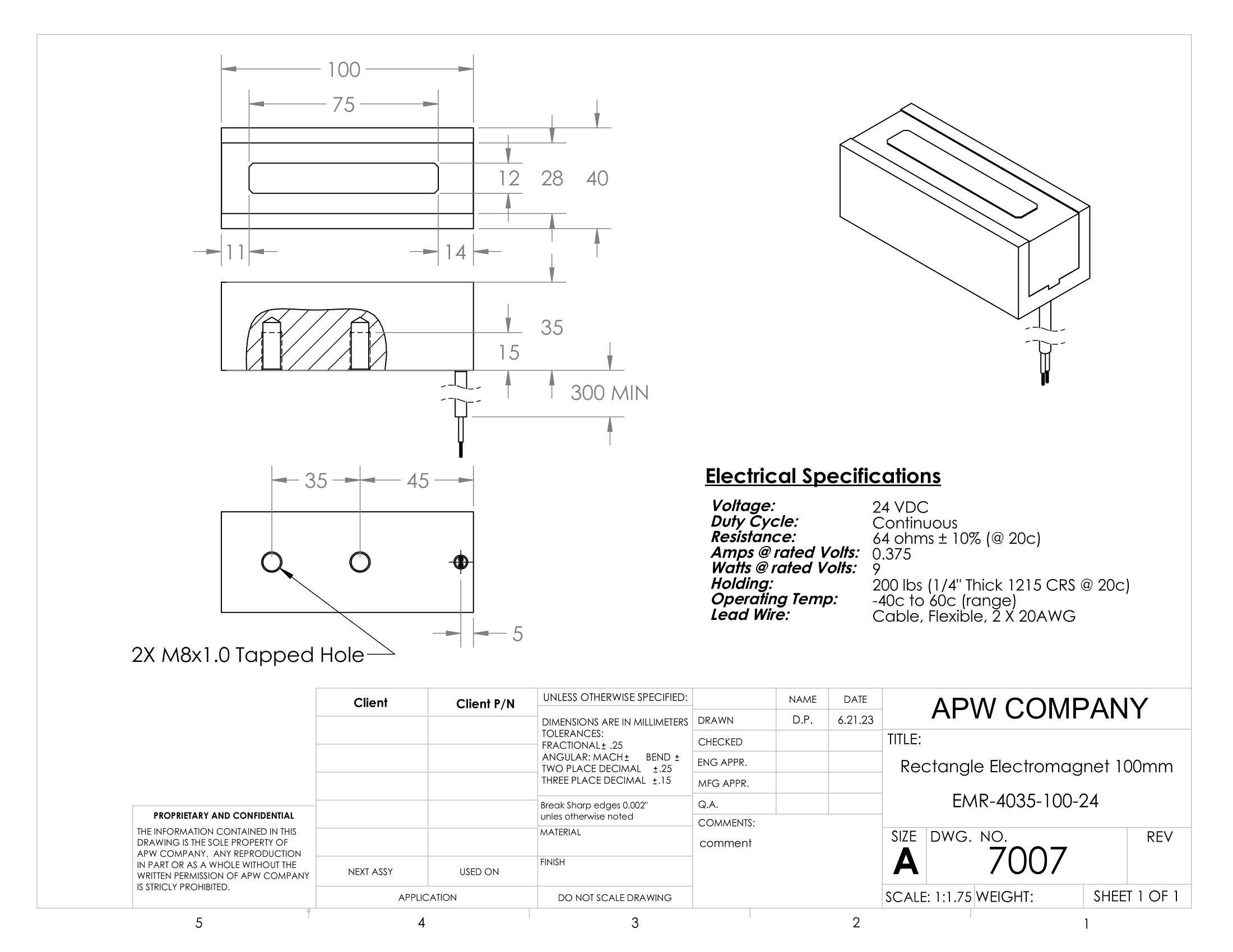 EMR-4035-100-24 is a high-quality rectangular electromagnet engineered to meet the rigorous demands of mechanical and electrical engineering applications. It produces an extremely strong magnetic field when energized with 24 volts DC, capable of holding up to an impressive 200 lbs. With a length of 100mm, it is suitable for a range of applications requiring a large holding capacity. This electromagnet is manufactured to the highest standards, ensuring consistent and reliable performance. Typical applications include but are not limited to lifting equipment, sorting machinery, and magnetic clamping systems. EMR-4035-100-24 is a dependable choice for any engineering project requiring a powerful and efficient electromagnet.