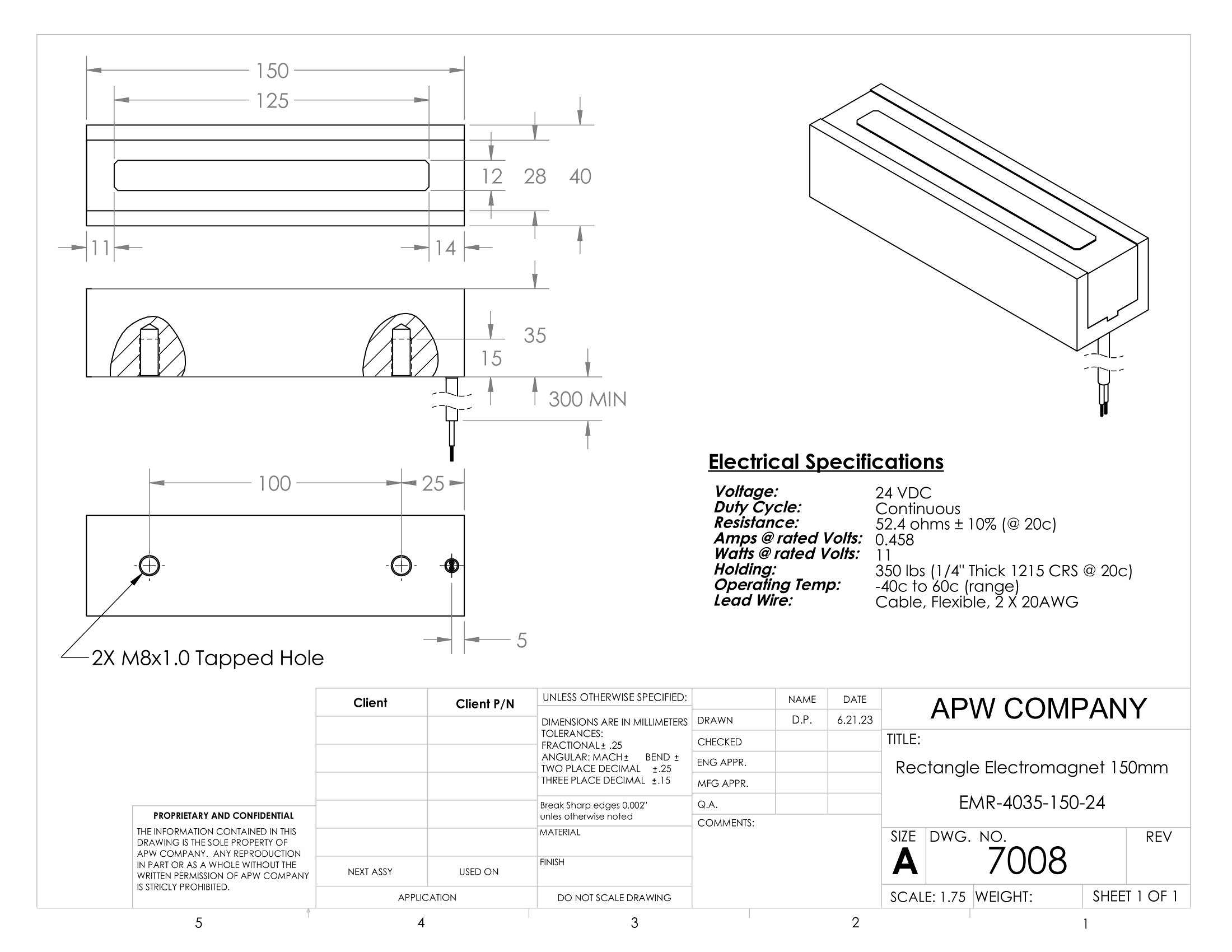 EMR-4035-150-24 Rectangular Electromagnet 150mm Length 24 volts DC