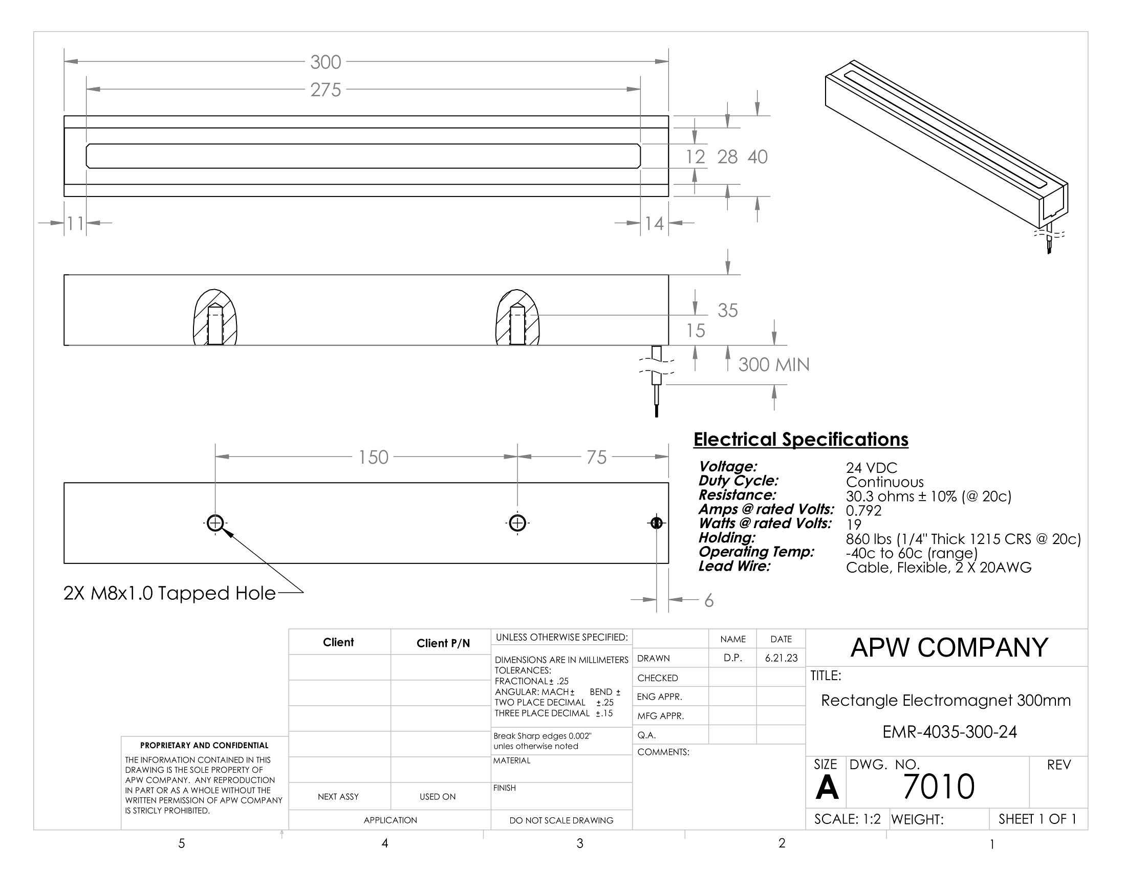 EMR-4035-300-24 is a high-quality rectangular electromagnet engineered to meet the rigorous demands of mechanical and electrical engineering applications. It produces an extremely strong magnetic field when energized with 24 volts DC, capable of holding up to an impressive 860 lbs. With a length of 300mm, it is suitable for a range of applications requiring a large holding capacity. This electromagnet is manufactured to the highest standards, ensuring consistent and reliable performance. Typical applications include but are not limited to lifting equipment, sorting machinery, and magnetic clamping systems. EMR-4035-300-24 is a dependable choice for any engineering project requiring a powerful and efficient electromagnet.