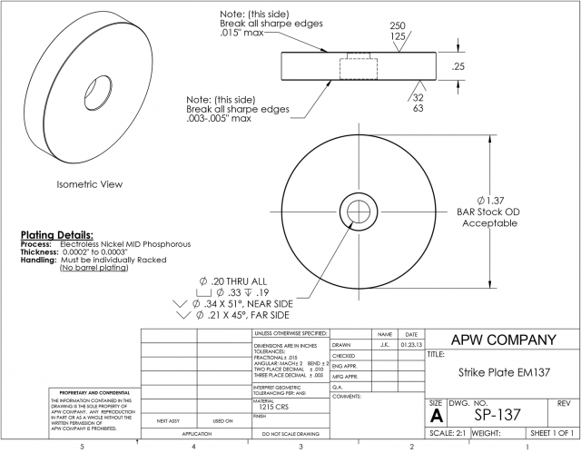 This 1.37″ diameter x .25″ thick round strike plate, armature plate or keeper plate is made of 1215 CRS and is Electroless Nickel plated. When selecting a strike plate, armature plate or keeper plate select a plate equal or greater than the diameter of your electromagnet. In applications where alignment may not be optimal it is always recommended that you select a strike plate, armature plate or keeper plate size that is larger than the diameter of the electromagnet. Be sure to select our mounting screws that allow your plate to articulate which assists in alignment and flush contact with your electromagnet for maximum holding forces.