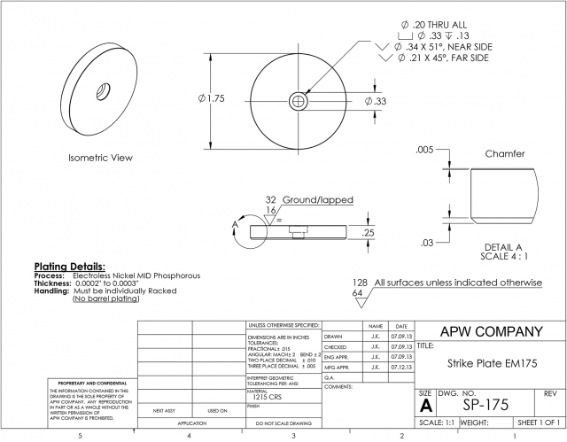 This 1.75″ diameter x .25″ thick round strike plate, armature plate or keeper plate is made of 1215 CRS and is Electroless Nickel plated. When selecting a strike plate, armature plate or keeper plate select a plate equal or greater than the diameter of your electromagnet. In applications where alignment may not be optimal it is always recommended that you select a strike plate, armature plate or keeper plate size that is larger than the diameter of the electromagnet. Be sure to select our mounting screws that allow your plate to articulate which assists in alignment and flush contact with your electromagnet for maximum holding forces.